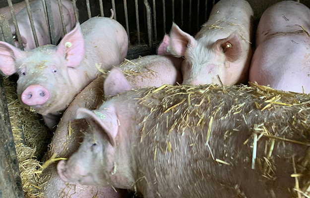 Schweine: Unsere Schweine sind in einem "dänischen" System aufgestallt. Im hinteren Teil des Stalls befindet sich Stroh und im vorderen Teil eine Betonplattform. Zur Verrichtung der Notdurft suchen sich die Schweine eine Ecke im Stroh aus. Das restliche Stroh bleibt trocken und sauber. Bei Kälte liegen die Schweine ins trockene Stroh, bei Hitze kühlen sie sich auf der Betonfläche. Das Futter der Schweine besteht vor allem aus einer hofeigenen Getreidemischung und Kartoffeln.