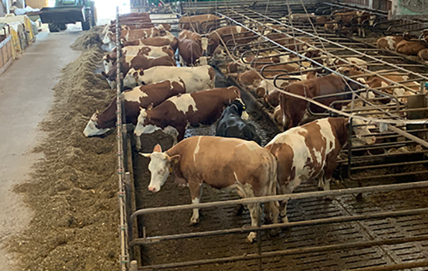Im Sommer füttern wir frisches Gras und Heu, im Winter vor allem Maissilage und Heu, während des ganzen Jahres füttern wir eine auf die anderen Futtermittel abgestimmte Getreidemischung zu, die wir aus unserem Getreide mischen.
